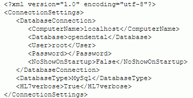 - The information for connecting to the database is in the FreeDentalConfig.xml file in the application folder. This is the same file that the main Open Dental program uses to connect to the database. The information in the file must be accurate before starting the OpenDentalHL7 service.