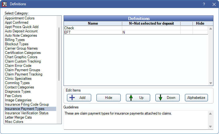 The Insurance Payment Types definition determines the payment type options available when Finalizing Insurance Payments.