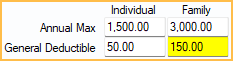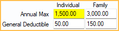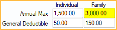 Annual Max: The family's annual maximum. Usually this value is entered in the Family column, Annual Max field on the Benefits Window.