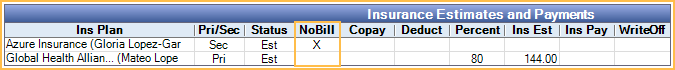 From Edit Procedure, double-click on the estimate for the insurance that should not be billed. The Claim Procedure opens. Check Do Not Bill to This Insurance. Estimates then show an X in the NoBill column of the Insurance Estimates and Payments grid.