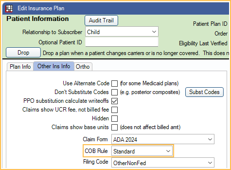 Set the COB Rule for an insurance plan in the Edit Insurance Plan: Other Ins Info tab. Set the default COB rule in Preferences.