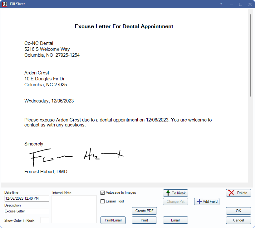 Use the options at the bottom of the Fill Sheet window to send the letter. Sent letters can be viewed in the patient's Chart Module and Account Module.