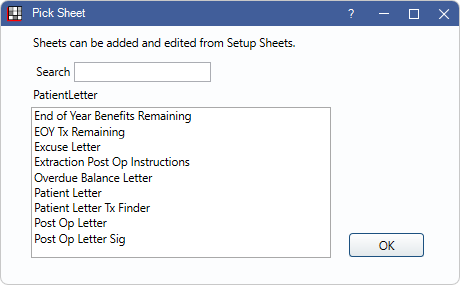 The Pick Sheet window lists all custom sheets with a type of PatientLetter will show. Double-click a sheet to use the letter, and Fill Sheet opens.