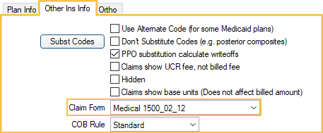 - The Claim Form is selected automatically based on the claim form selected in Insurance Plan Setup, Other Ins Info tab.