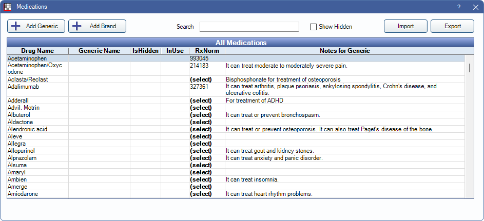 The Medications master list contains all medications (generic and brand name) that can be added to a patient's chart.
