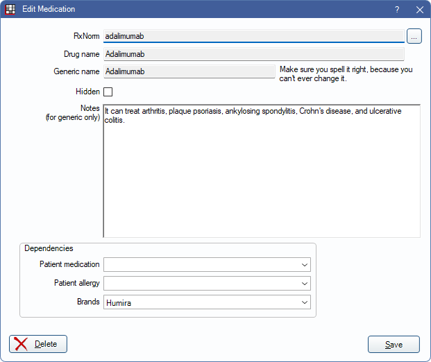 - Notes: Only allowed on generic medications. Every medication should have a note, no matter how short. They usually consist of the therapeutic category, and any precautions or interactions to be aware of. All medications attached to the generic medication show the same note. Right-Click the text box for additional options.