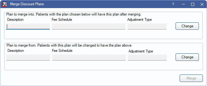 - Select the Plan to merge from. Click Change to select the discount plan to remove. Patients who have this discount plan are reassigned to the plan selected in Step 1.