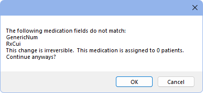 - If any medication fields (GenericNum, Medication Names, or RxCUIs) differ, the warning indicates which fields do not match, the total patients assigned the Medication to merge from, and that the change is irreversible.