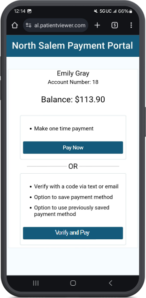 When Verify and Pay is selected, the patient chooses how to receive verification. The patient then enters the verification code and can make a payment.