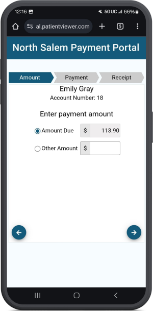When Pay Now is selected, the patient is prompted to enter an amount, then they can enter card details to make the payment.