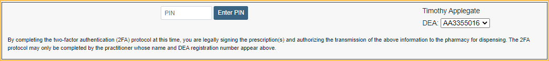 - The prescribing provider must enter their 4-digit pin. If this is the first time the prescriber has transmitted a controlled substance, they are prompted to create a pin instead.