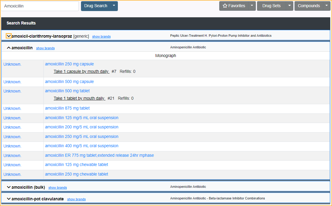 All matching drugs are displayed. If there are more 20 results total, click the dropdown next to a drug name to display all dosing options. If using the comprehensive version and there is an insurance formulary attached to this patient, formulary status appears in the first column. Click a formulary link to see therapeutic alternatives. See Ensora eRx Drug Formulary Checks.