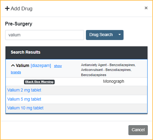 - In the Drug Search field, enter the drug name and click Drug Search.