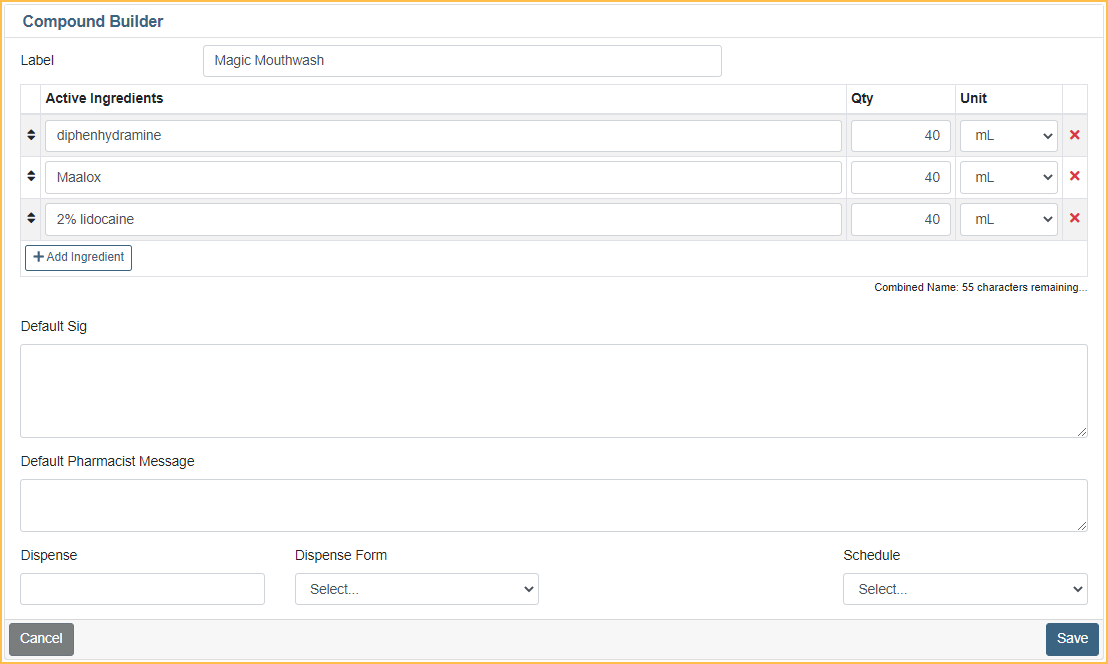 - Enter a name for the compound (e.g., Magic Mouthwash) in the Label box.