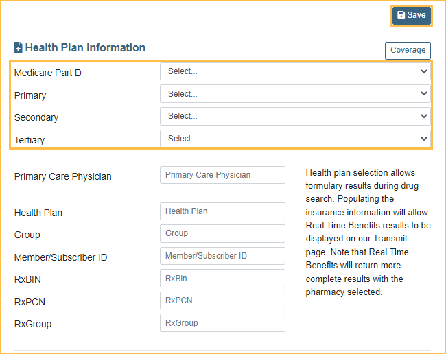 - In the Health Plan Information section, click the appropriate dropdown for the type of health plan (e.g., Primary, Secondary, etc.) then select the patient's health plan.