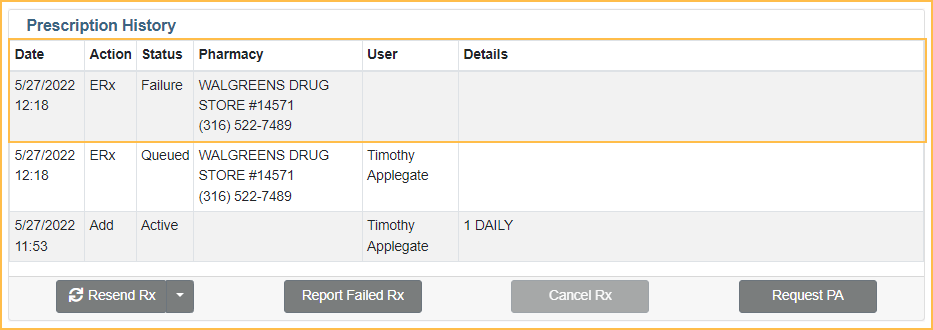 - Scroll to the bottom. In the Prescription History section, any Failure is noted in the status column.