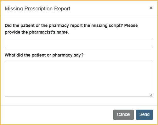 - Click Send to report it. When an explanation or outcome has been determined for the missing prescription, an Open Dental eRx team member will notify the office via phone.