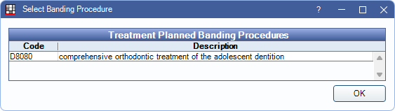 - Banding Procedure: Click [...] to select the banding procedure. The following window opens. Only treatment planned procedures are listed. Banding procedures are determined by codes added to the Ortho Case Procedures preference. Only one banding procedure can be associated with an Ortho Case.