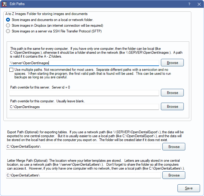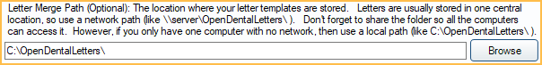 Letter Merge Path: This can be a local or network path. When entering a network path, make sure the folder is shared so all computers can access it. This folder must be created manually. The default folder name is OpenDentalLetters.