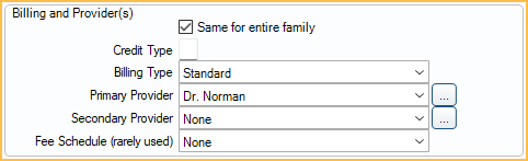 - If the status of any Same for entire family or Same for entire super family checkboxes was switched from unchecked to checked, information in the pertaining area (e.g., Address and Phone, Billing and Provider(s), etc.) for all family members or super family members is updated to match the patient.