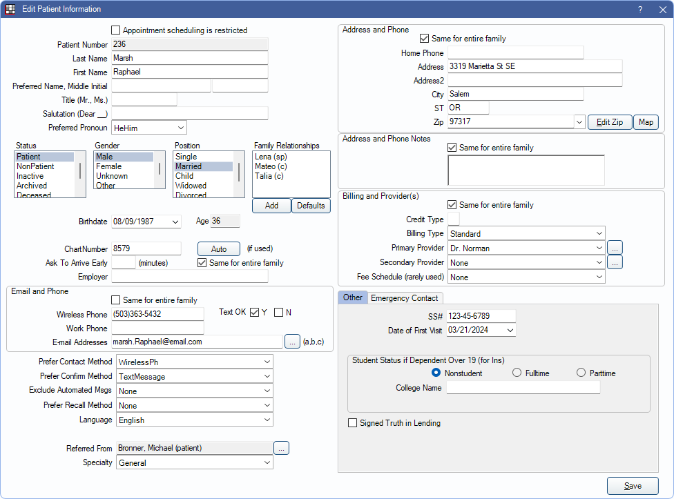 - Same for entire super family: Only visible when the patient is the head of a Super Family and the Allow syncing patient information to all super family members preference is enabled. When checked, address and phone information for the Super Family head are applied to all super family members (not just guarantors).