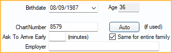 - Chart Number: Optional, but not recommended. Useful to enter patient IDs if the database was converted from another program or to enter numbers used for paper charts. Click Auto to assign the next available numeric chart number to the patient. This does not work if using alphanumeric ChartNumbers. ChartNumbers are only displayed in the Family Module.