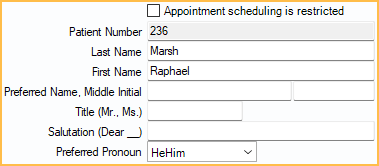 - Preferred Pronoun: Only displays when Show Preferred Pronouns for Patients is enabled in Preferences. Select a preferred pronoun to override the pronouns used for sheets. When set to None, the default pronouns for the patient's selected gender are used.