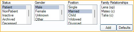 - Family Relationships: Indicates this patient's family relationship (e.g., guardian, spouse, father, mother) to other patients. See Family Relationships for additional details and instructions for setting up Family Relationships.
