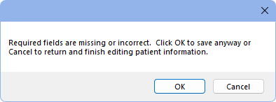 Offices can prompt staff to complete certain fields using Required Fields marked with an asterisk (*). If required fields are incomplete when clicking Save on the Edit Patient Information window, a message notifies them that required fields are missing or incorrect.