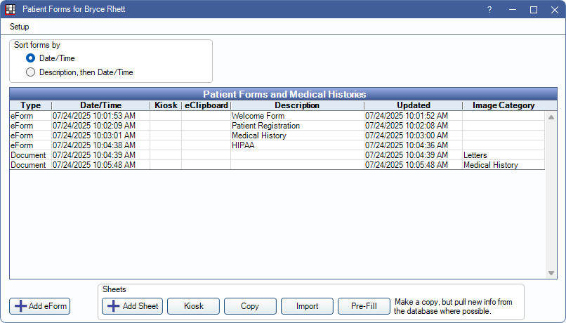 To have a patient review a previous Medical History Sheet and make changes, highlight the most recent Medical History Sheet and click Pre-Fill to open it. The pre-filled copy does not have a signature and does have today's date. Print it, send it to the Kiosk, or eClipboard, so the patient can make any changes and sign it. Changes are saved to the new form; they do not overwrite the original. Then import the new form, or enter the changed data.