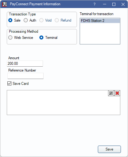 Terminal for Transaction: Enabled only when using Terminal as the processing method. Select the credit card terminal device to use for this transaction (i.e., used to process a physical credit card). Defaults to the last selected terminal used on that workstation.