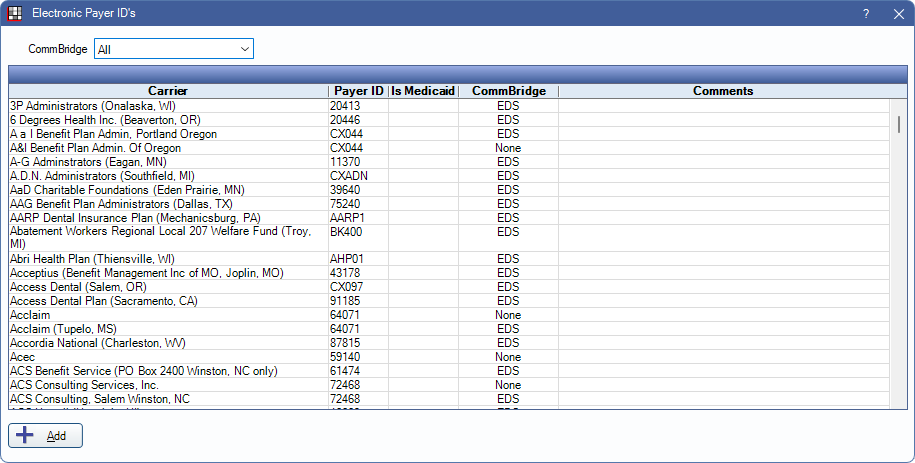 CommBridge: Defaults to the default clearinghouse. Displays Payer IDs updated or added by the clearinghouse. Select All to see all payer IDs regardless of how they were added.