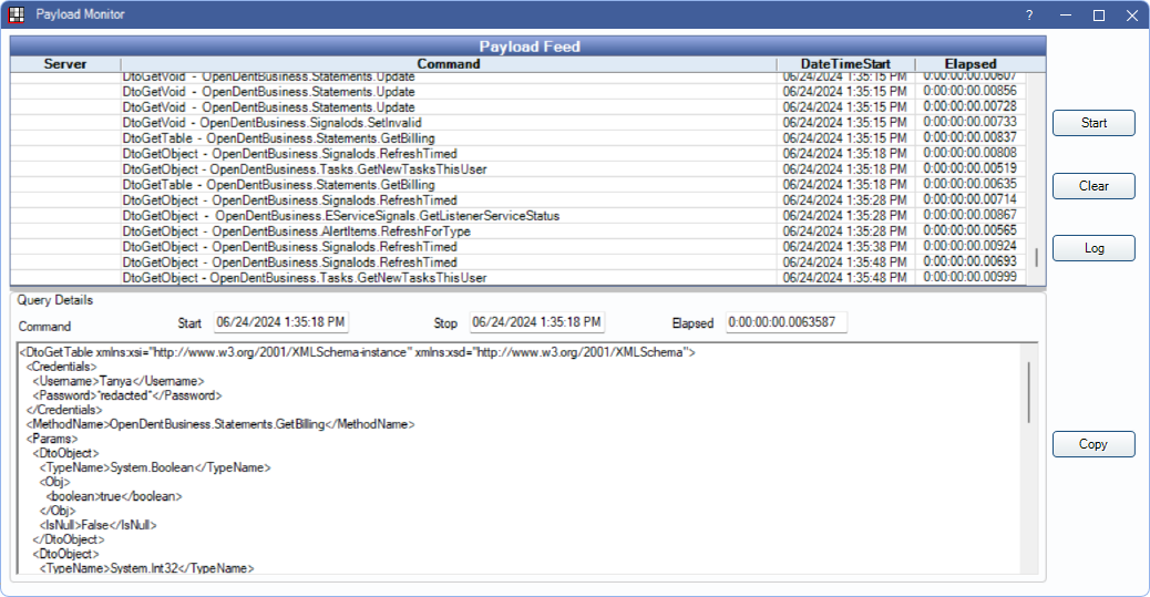The Payload Monitor is only available when connected to Open Dental via Middle Tier. This window can remain open in the background to allow monitoring during normal use of the program.