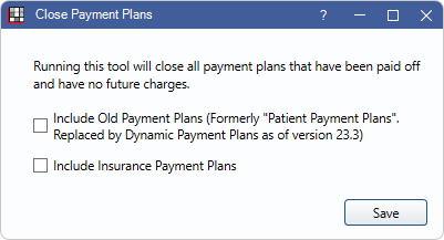 Once the tool is clicked, the above is displayed. By default, running the tool closes Payment Plans with zero balance or a negative balance and no future charges. Choose additional options to include other payment plan types.