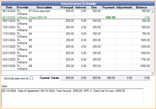 Exclude past activity: When checked, only future dated line items show in the Amortization Schedule and past activity is hidden. When unchecked, all activity shows. Totals are not affected by this setting. To set the default setting for the checkbox, see Preferences, Payment Plans exclude past activity by default.