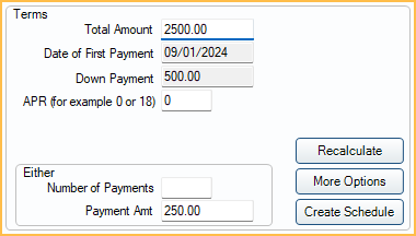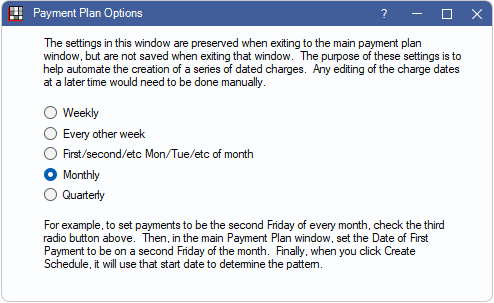 More Options: Click to open the Payment Plan Options window and select the frequency of payments. The default frequency is Monthly.