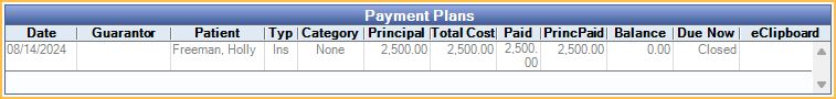 All closed plans for the patient list in the Payment Plans grid in a light text color.