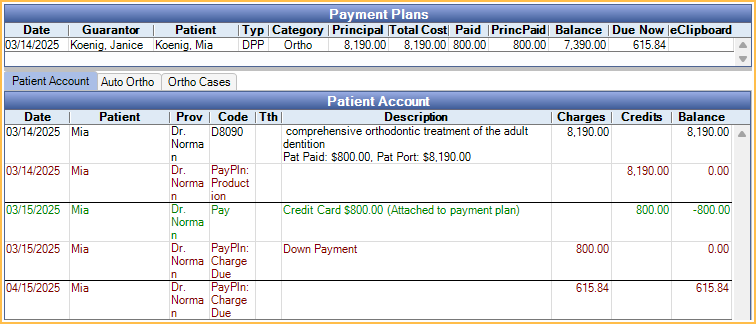 Age Credits and Debits (Default): Charges Due, payment plan production, and payments show as line items in patient account grid and affect balances and aging.