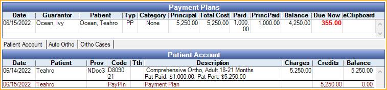 Charges Due, payment plan production, and payments show as line items in patient account grid and affect balances and aging.