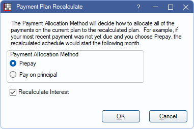 If Pay on principal is selected as the Payment Allocation Method and interest is also recalculated, the prepayment will first subtract from the total balance. Then the remaining payments will be recalculated based on the new balance (new balance / remaining payments = new due amounts). This may change the total numbers of payments or last payment date of the payment plan.
