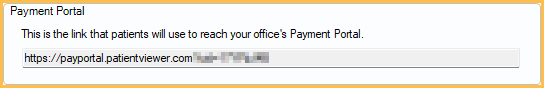 - Payment Portal URL: Copy the Payment Portal URL to send to patients to make online payments. To place the link on the office website, contact the office webmaster. Offices using PaySimple must use this option.