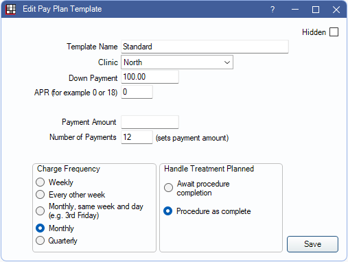 Click Save to close the window and retain changes to the template. Check Hidden if the template is no longer in use.