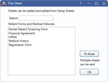 Select one or more available Sheets to create new forms for a patient or send them to Kiosk or eClipboard to be filled out electronically. Sheets with a type of PatientForm or MedicalHistory are listed. Consent forms are also listed if the option Patient Forms window show consent forms is enabled in the Patient Form Options window.