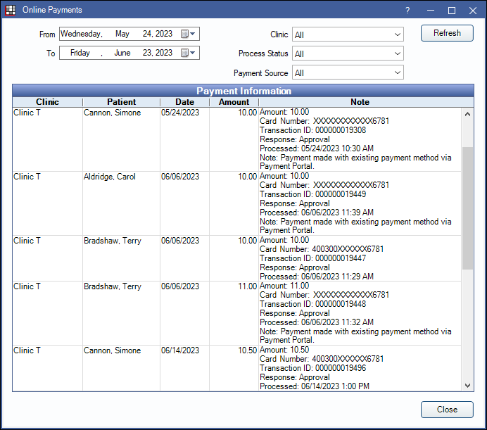 Click Refresh to update results in the Payment Information grid after setting filter options.