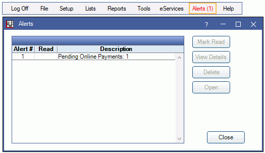 Alternatively, in the Main Menu, click Alerts. Select the Pending Payment alert, then click Open.