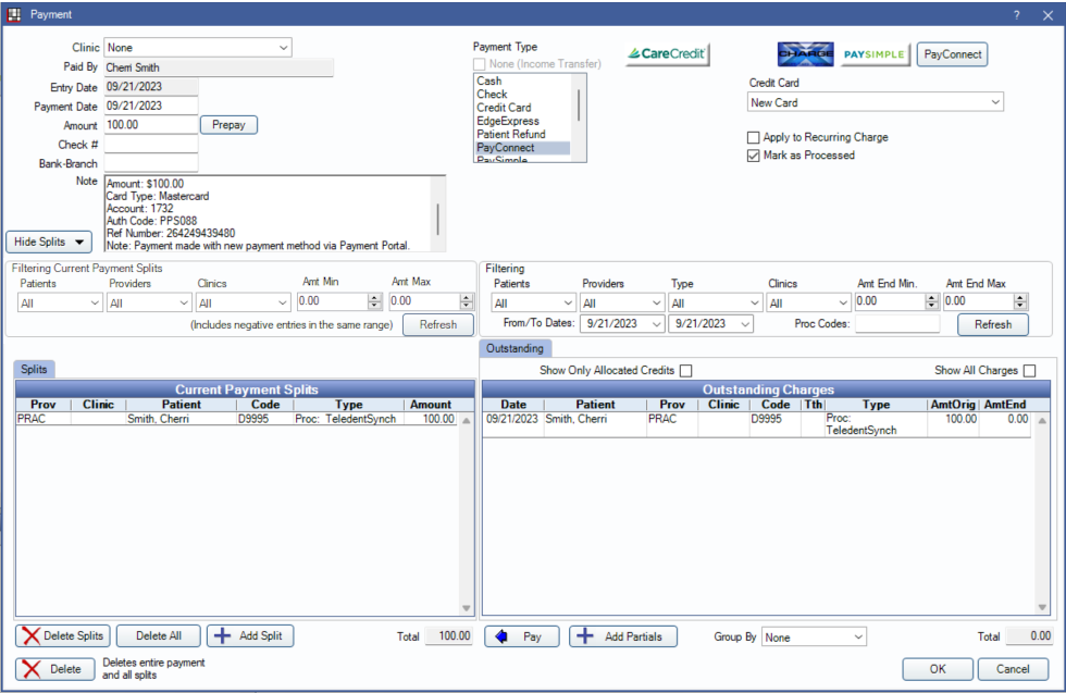 Patient Payments made through the Payment Portal or using CareCredit Lookup or Apply appear in this window