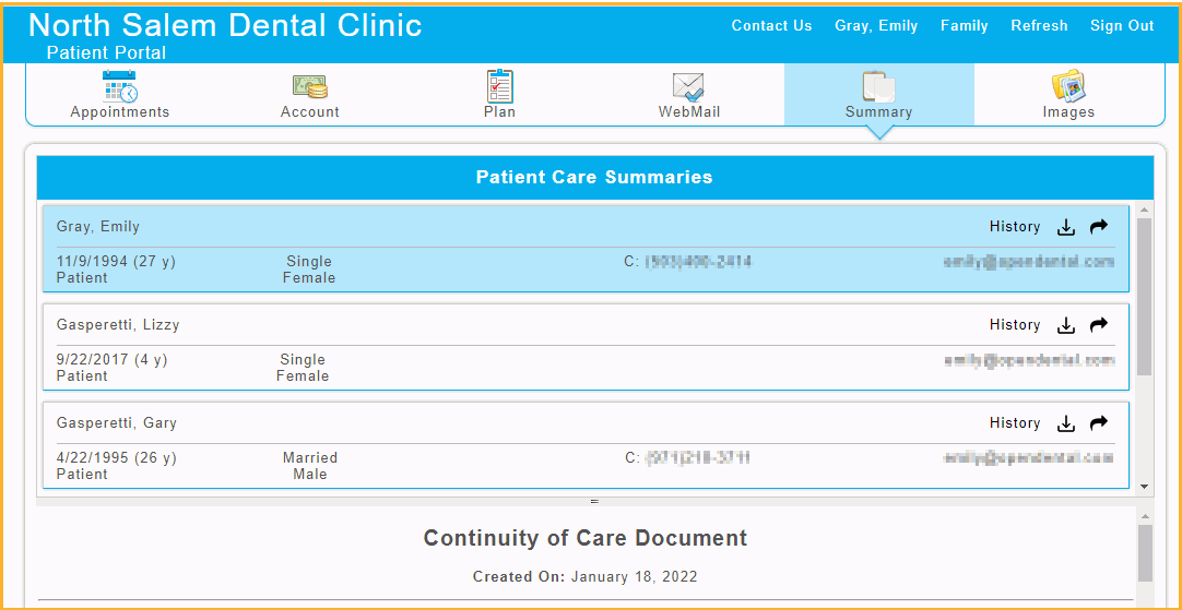 In the Summary tab, patients can view, download, or transmit Continuity of Care Document (CCD).