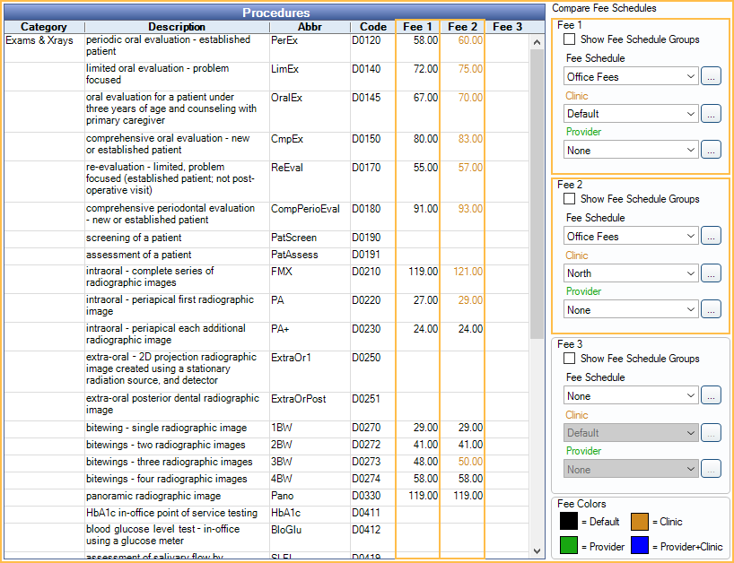 As the user selects criteria, the fees in the corresponding column will change to reflect the current fee entered for the fee schedule, clinic, and/or provider. The fee color is a quick method of identifying if a fee is global or specific. A color legend shows in the lower right. Customize colors in Definitions: Fee Colors.