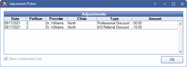 Link Existing Adj: Click to attach an existing adjustment to a completed procedure. Opens the Adjustment Picker window (see below). Adjustments not attached to a Paysplit, procedure, or Payment Plan are listed. Select an adjustment and click OK.