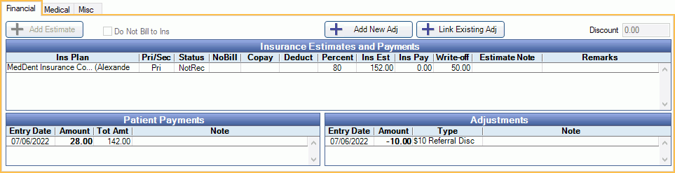 View insurance estimates, payments, and adjustments attached to a procedure from the Financial tab.
